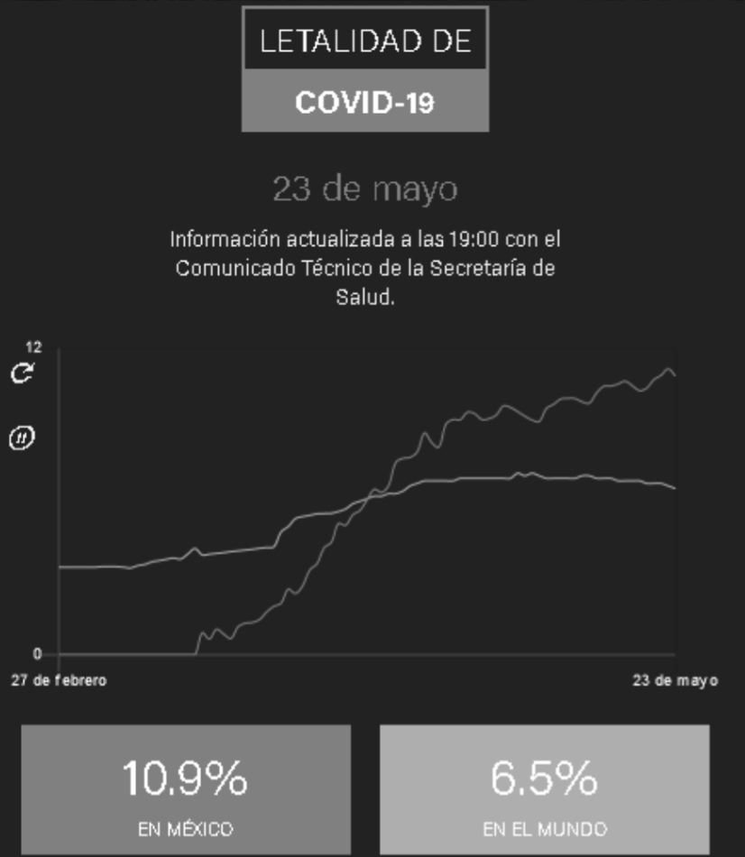 El aumento de las personas contagiadas de este virus, llega a ser preocupante ya que el caso de letalidad en México es del 10.9% y a nivel mundial es del 6.5%. Esto se puede observar en la tabla siguiente obtenida de la página de “Secretaría de Salud”